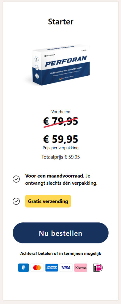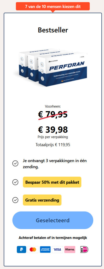 Natuurlijke ingrediënten: Perforan maakt gebruik van zorgvuldig geselecteerde, natuurlijke, werkzame stoffen die specifiek het mannelijk lichaam ondersteunen bij zijn kracht en uithoudingsvermogen.